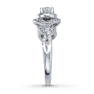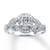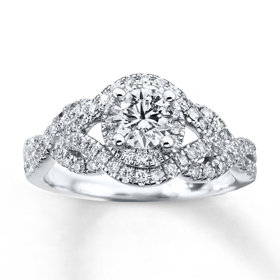 A captivating round diamond in this dazzling engagement ring will take her breath away. Additional pave diamonds in romantic twists of 14K white gold complete the look. This fine jewelry ring has a total diamond weight of 1 carat. Available online while supplies last.Jewelry is not eligible for in-store pickup.Jewelry may only be shipped either to your home address or to an alternate address.