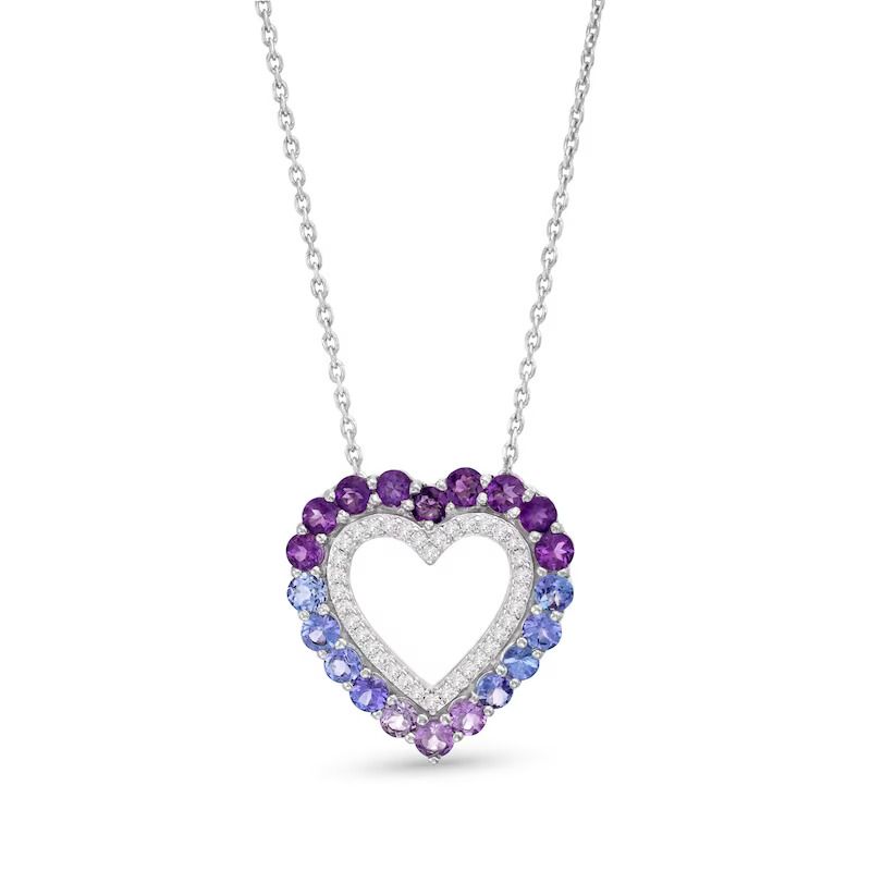 This gorgeous heart-shaped necklace shines with violet-hued gemstones set in classic sterling silver. Round amethysts and tanzanite combine for a beautiful outline, and round white sapphires sparkle to finish the look. The pendant hangs from an 18-inch cable chain and secures with a lobster clasp.